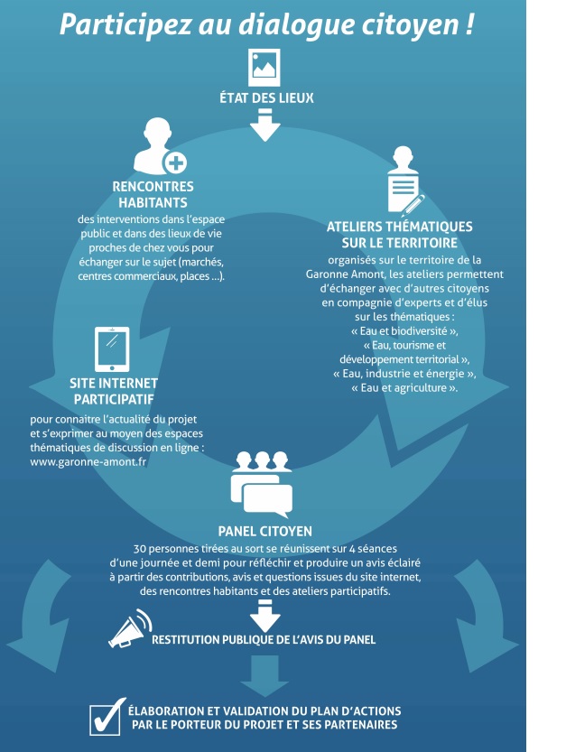 Pendant près de 6 mois, les échanges entre citoyens, élus et acteurs locaux sous forme de rencontres dans l’espace public, d’ateliers de travail thématiques, d’espace participatif sur internet ainsi que d’un panel d’une trentaine de citoyens ont permis la mise en débat de questions cruciales concernant les différents usages de l’eau et la préservation des milieux aquatiques. Ces différents dispositifs de concertation déployés à travers le territoire Garonne amont∗ ont bénéficiés d’une large participation, les échanges ont été riches et donc très constructifs.