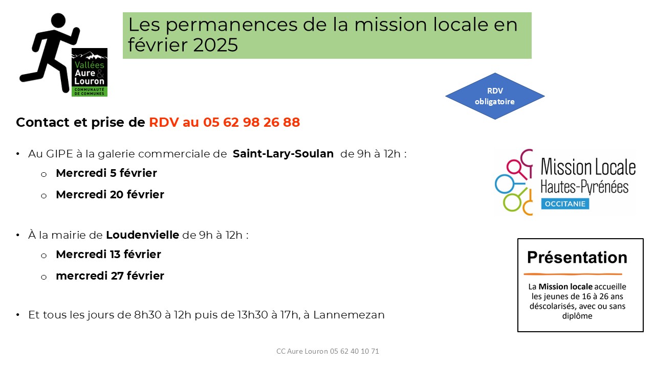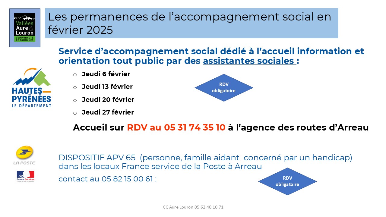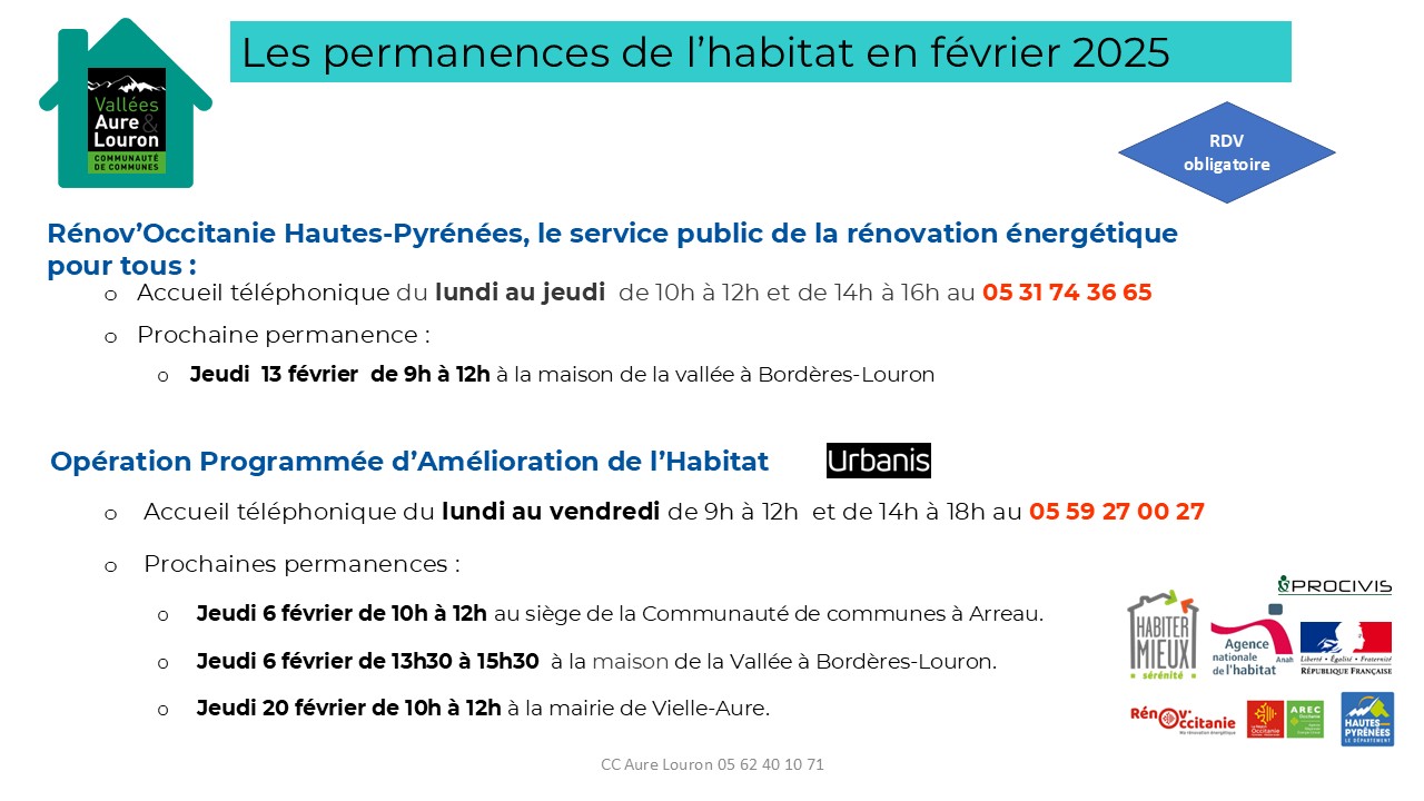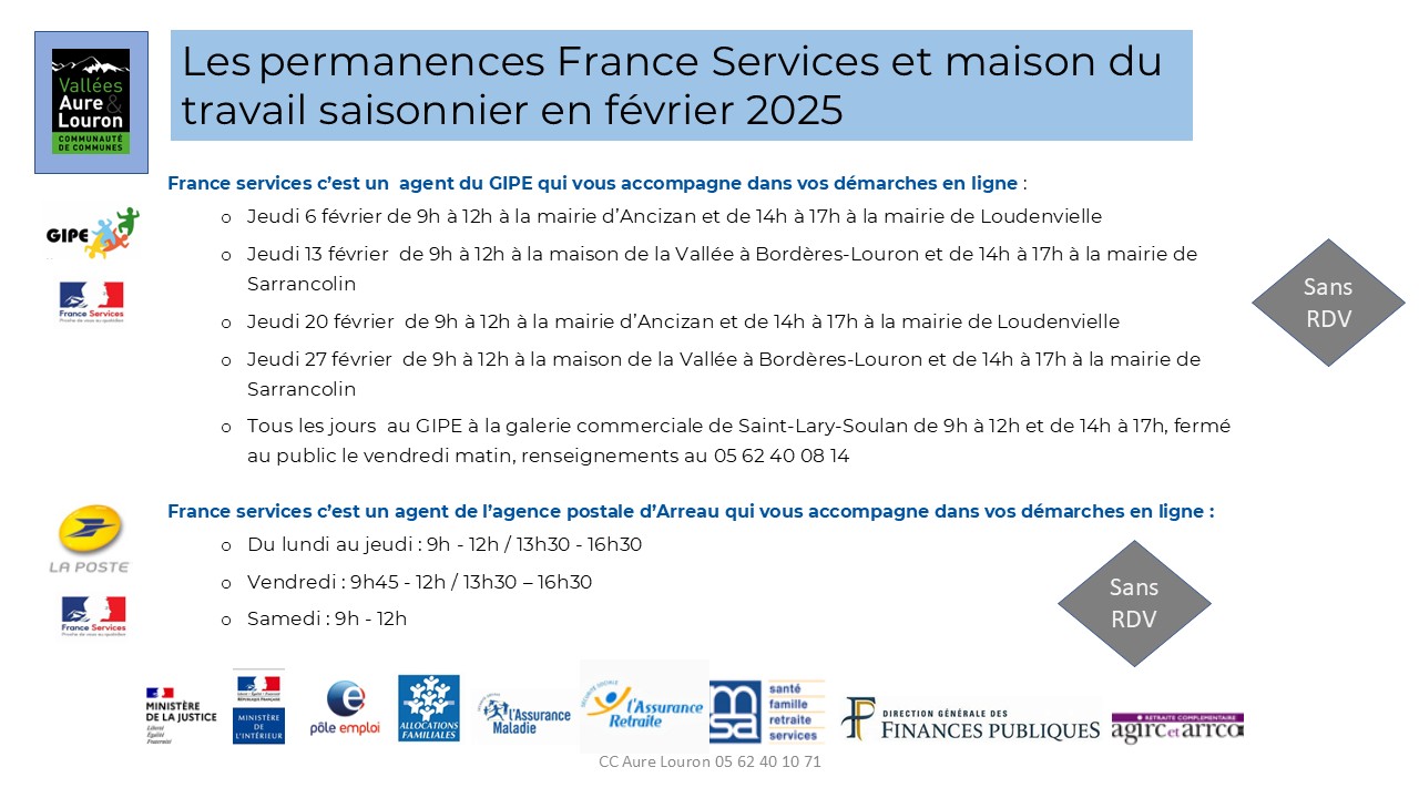 Les permanences en Février 2025 : DDFIP, Renov'Occitanie, OPAH, France Services, Maison du travail saisonnier, CIDDF, Mission Locale, Accompagnement social